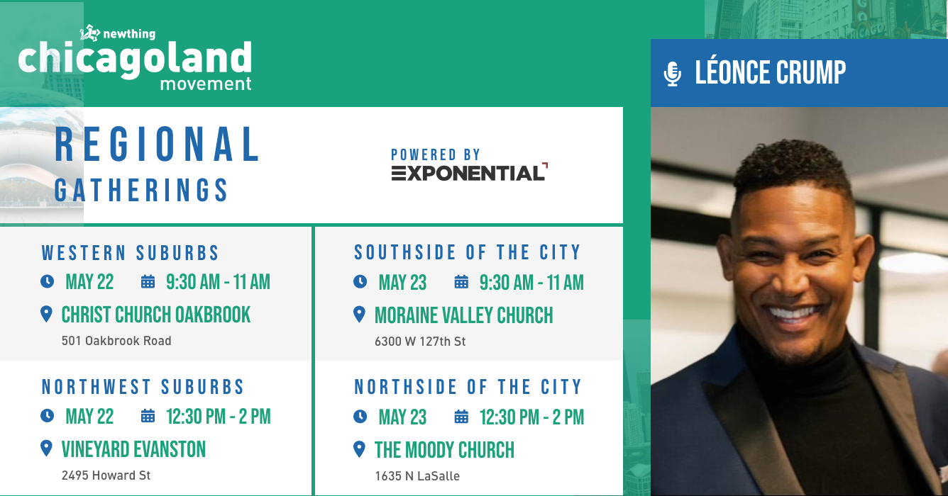 Join us IN-PERSON May 22 - May 23 for our Chicagoland Movement REGIONAL Gatherings powered by Exponential!* We will hear from Jon Ferguson, Network Leaders and our Guest Speaker: Léonce Crump.